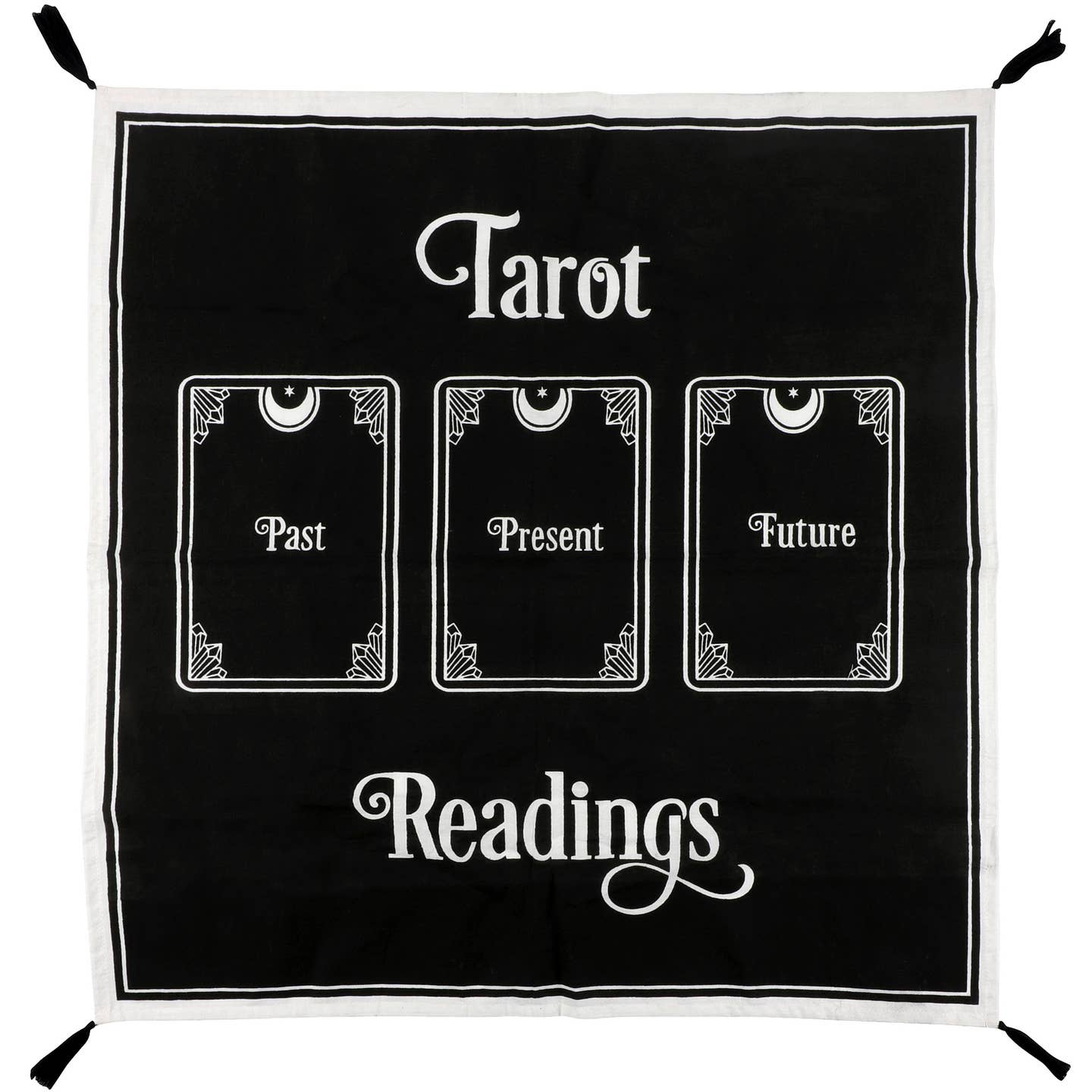 This tarot cloth features corner tassels and 'Past', 'Present', and 'Future' printed in white for laying a linear three-card spread. Use for tarot or oracle card readings, decorating a sacred space, or as mystical home decor! Measurements: 27.5" inch square. Material: Cotton.