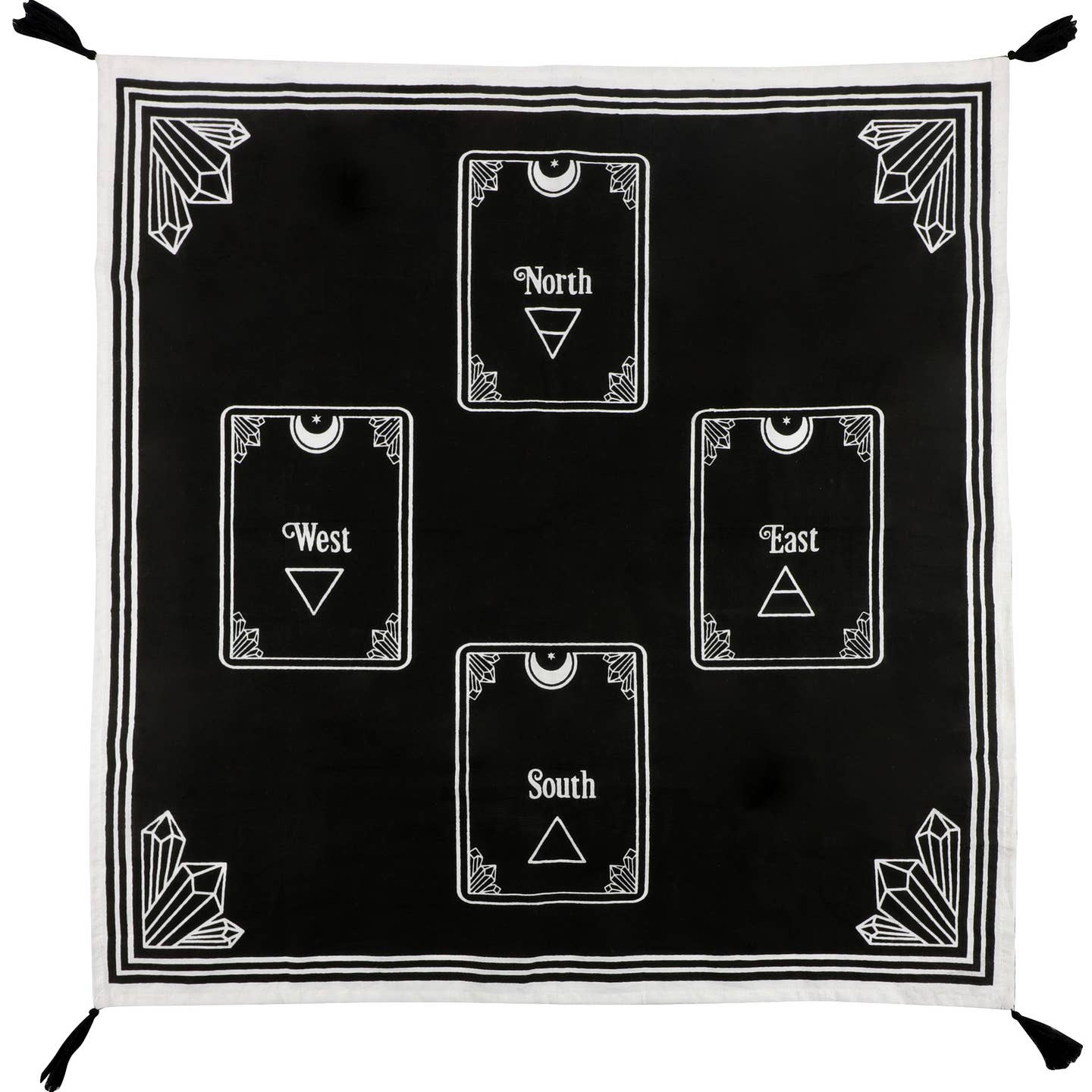 This tarot cloth features corner tassels and 'North', 'South', 'East', and 'West' printed in white for a four-card spread. Use for tarot or oracle card readings, decorating a sacred space, or as mystical home decor! Measurements: 27.5" inch square. Material: Cotton.