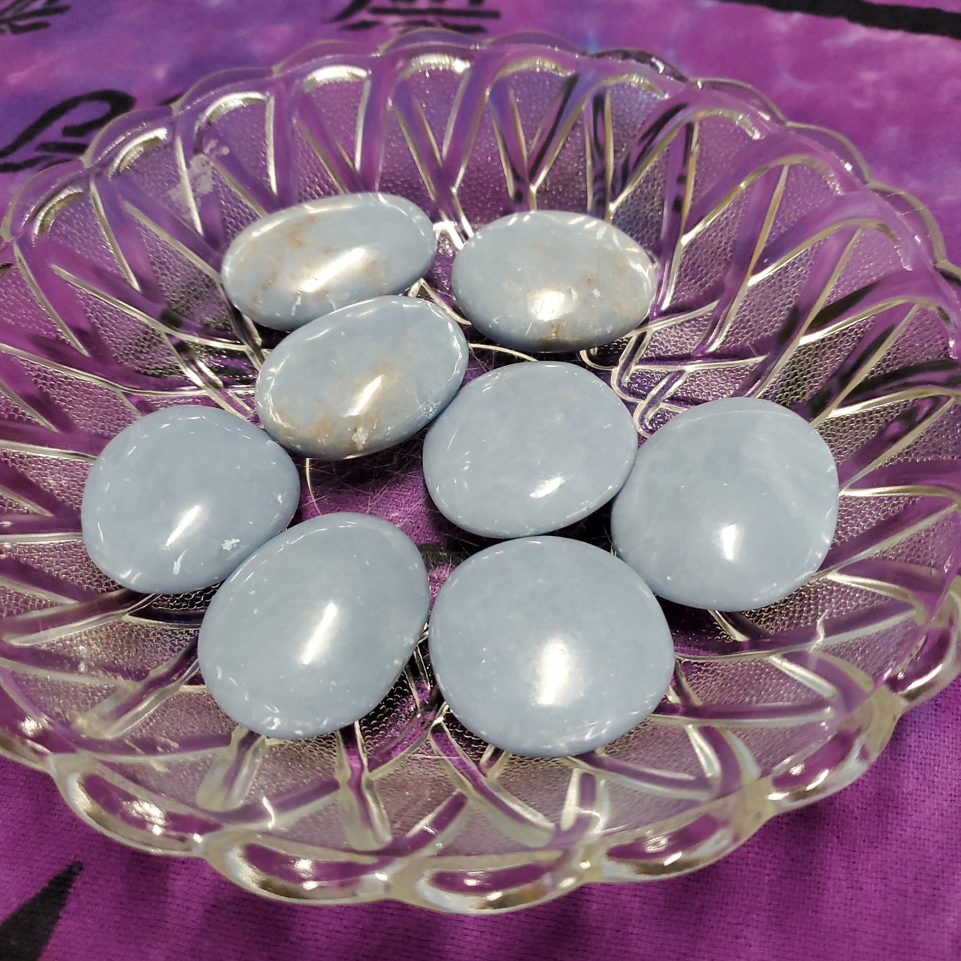 Angelite also called Anhydrite is a mineral that has the healing power of peacefulness. Its healing properties include releasing constriction of the throat and neck, helps with emotions, and creative communication. Angelite is a soft mineral and should be treated with care when polishing.