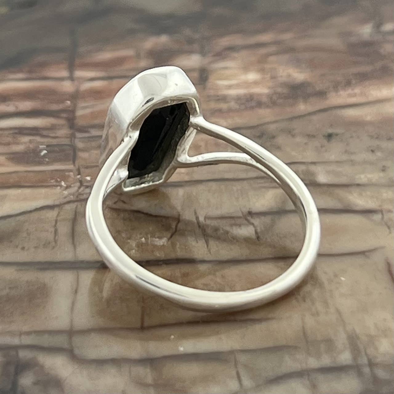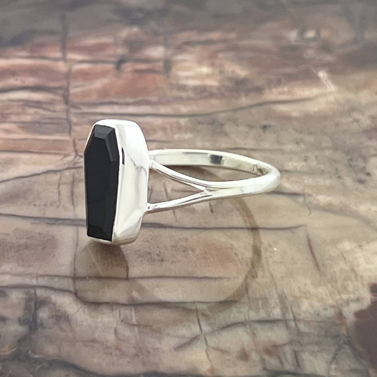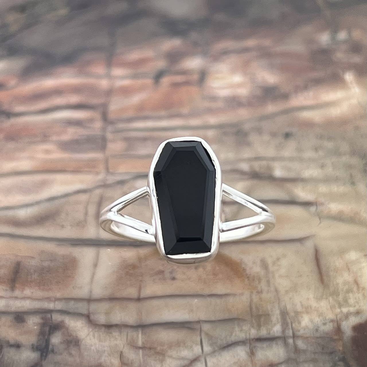 BLACK ONYX STERLING SILVER COFFIN RING A powerful protection stone, Black Onyx absorbs and transforms negative energy, and helps to prevent the drain of personal energy. Black Onyx aids the development of emotional and physical strength and stamina, especially when support is needed during times of stress, confusion or grief.