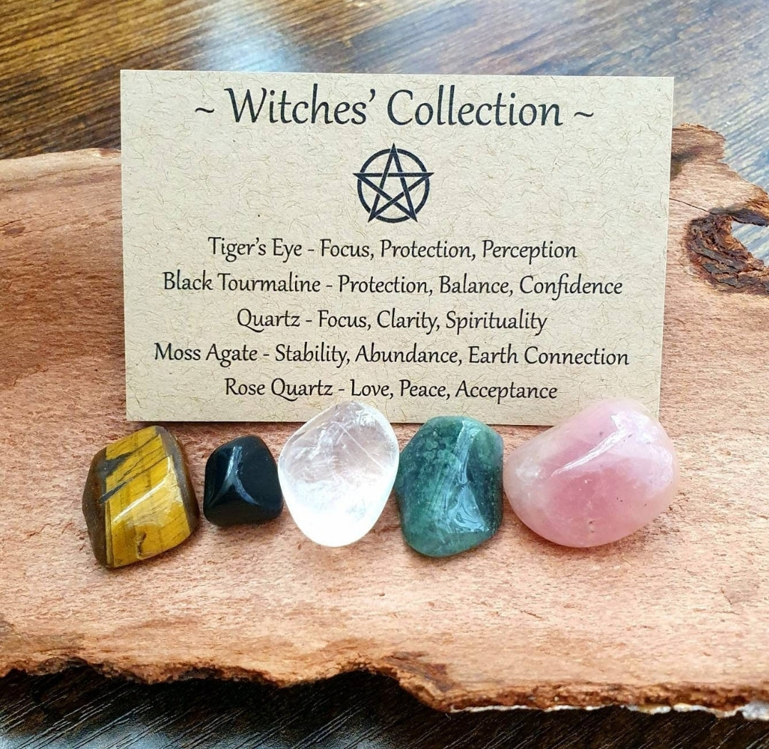 Tiger's Eye- Focus, Protection, Perception Black Tourmaline- Protection, Balance, Confidence Quartz- Focus,Clarity, Spirituality Moss Agate Stability,Abundance, Earth Connection Rose Quartz - Love, Peace, Acceptance
