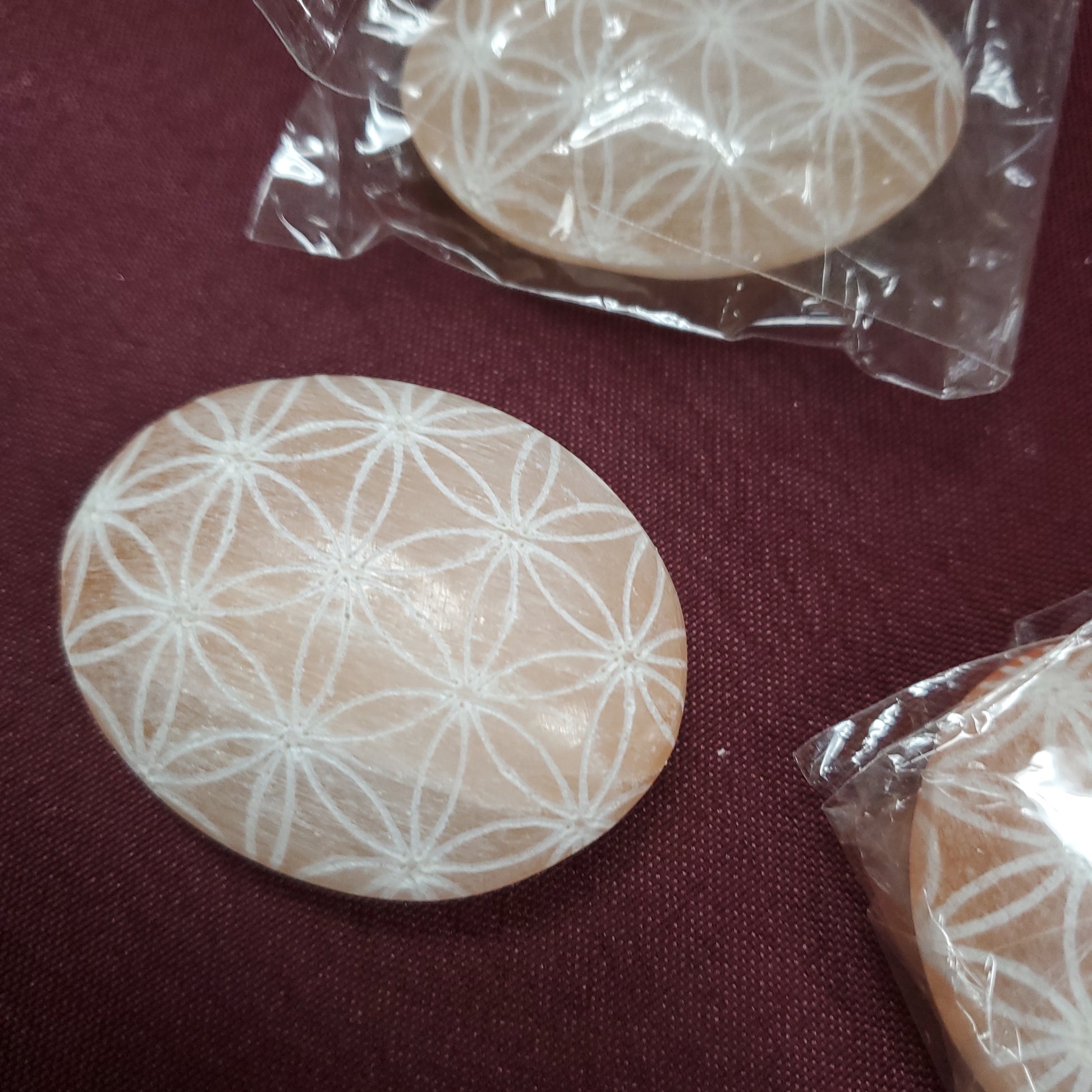 You will receive an engraved selenite palm stone similar to the one in the photo. These are made to order. They have a triple moon engraved on one side. Approximately 2 x 2.5 inches. Selenite crystals work to help you to bring light down from the higher realms into the physical body, to create personal transformation. The white or transparent crystals have a strong vibration that may open the crown chakra and the soul star chakra.