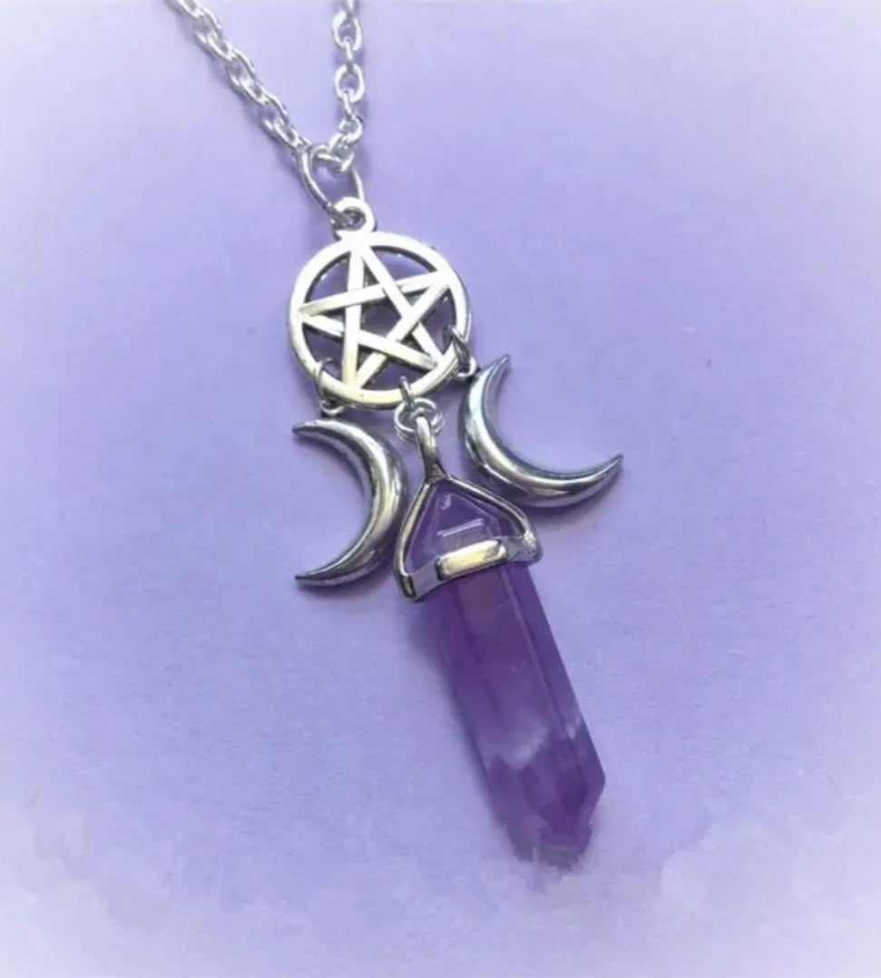 Amethyst Point with Pentacle and Two Moons Necklace