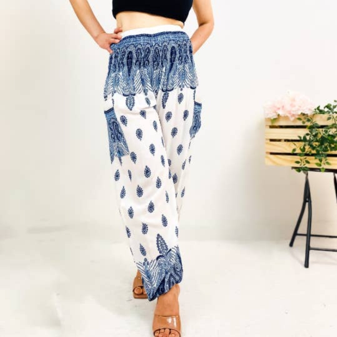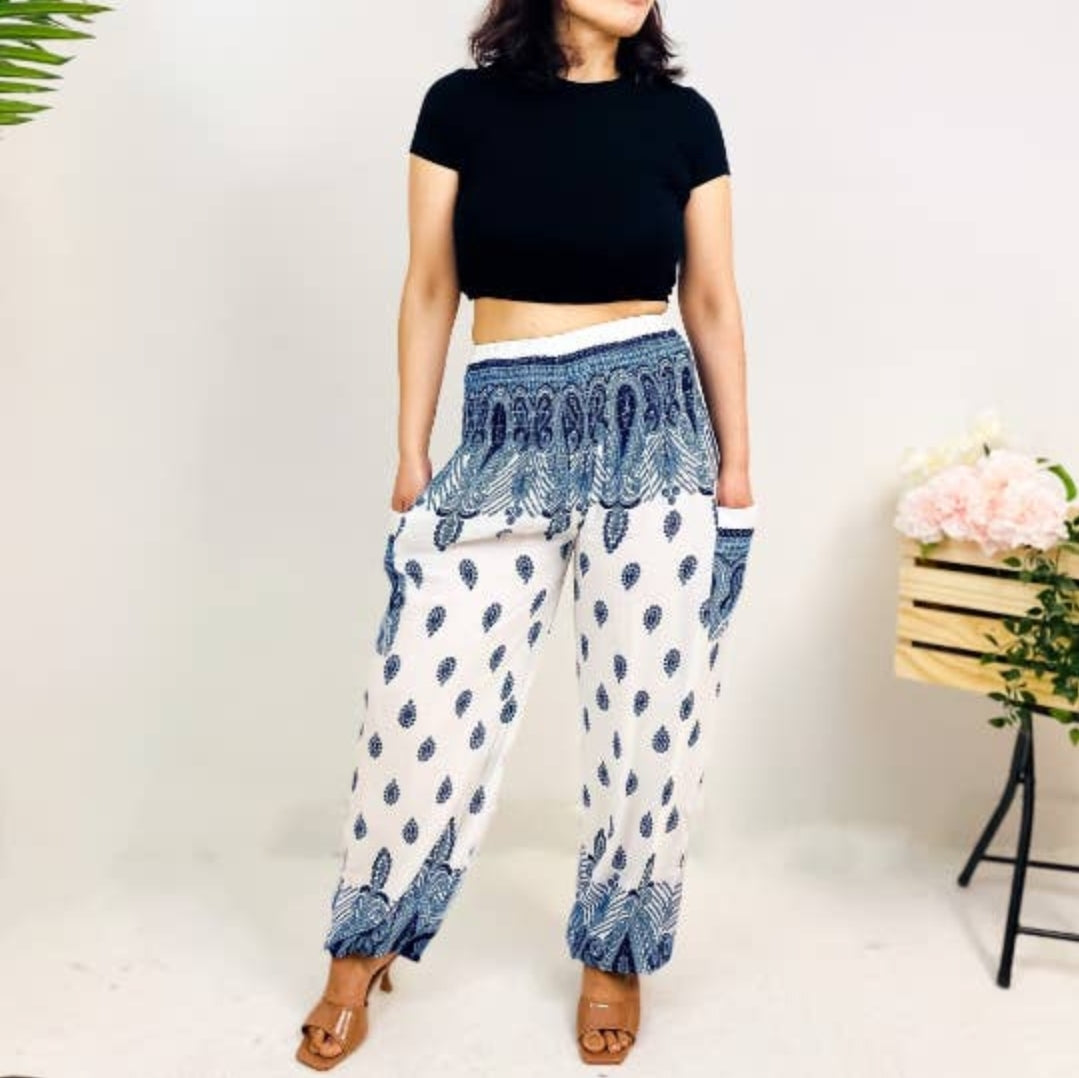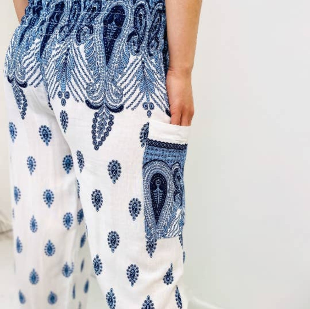 These handmade cotton festival pants are perfect for achieving the perfect summer and beach vibes. Made of 100% organic cotton, the boho, and chic festival fashion style adds just the right amount of style to any outfit. Handmade in nepal Material: organic cotton Adjustable waist Size: one size Fits from us size small to large Adjustable waist Two side pockets.