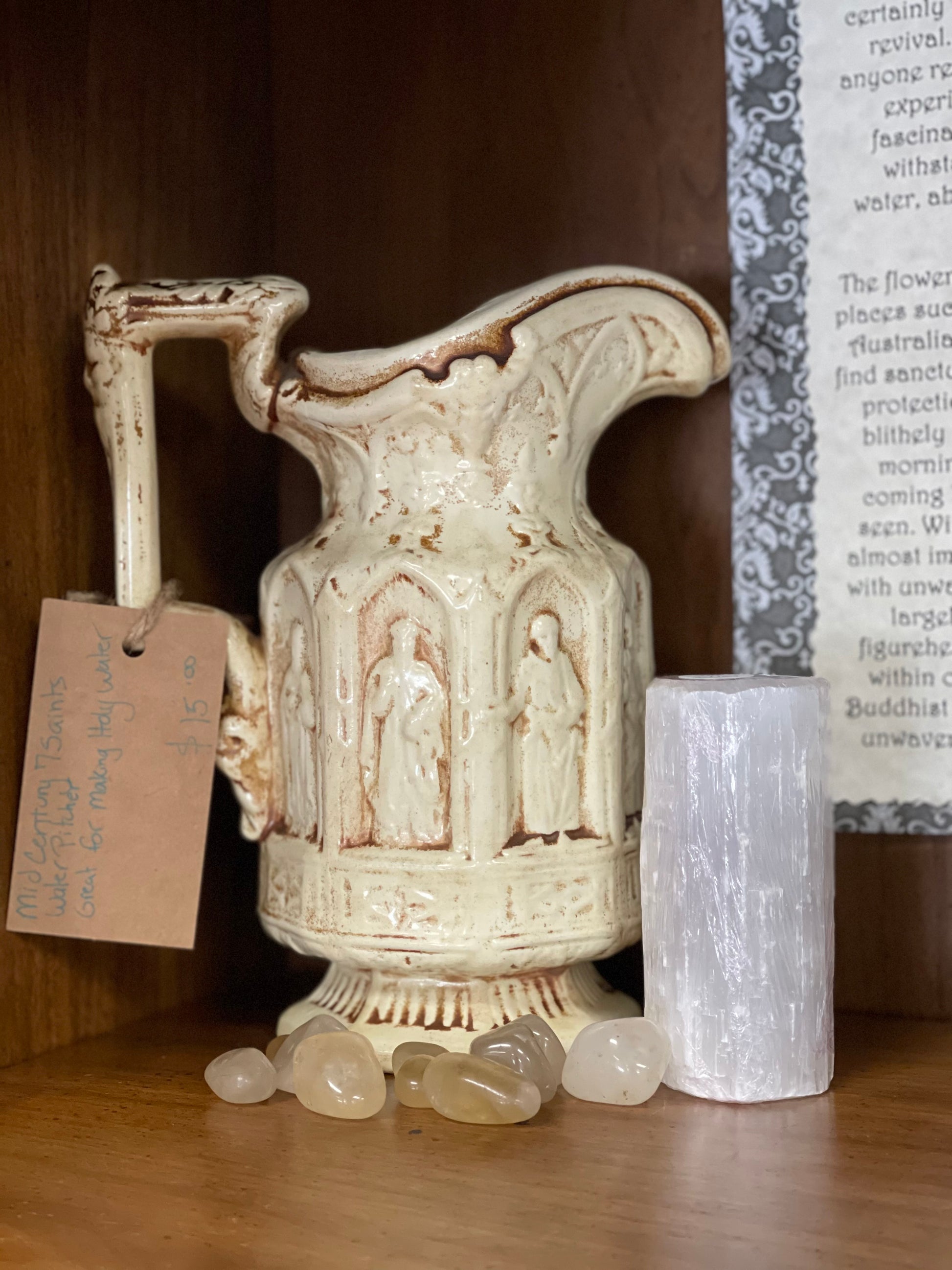 Images are of the Blessed Virgin Mary, Sacred Heart of Jesus, St. Francis, St. Anthony with child Jesus, St. Jude, St. Joseph, and the Infant of Prague. It is finely detailed. There are no markings on the pitcher, but may possibly have been made in Italy.