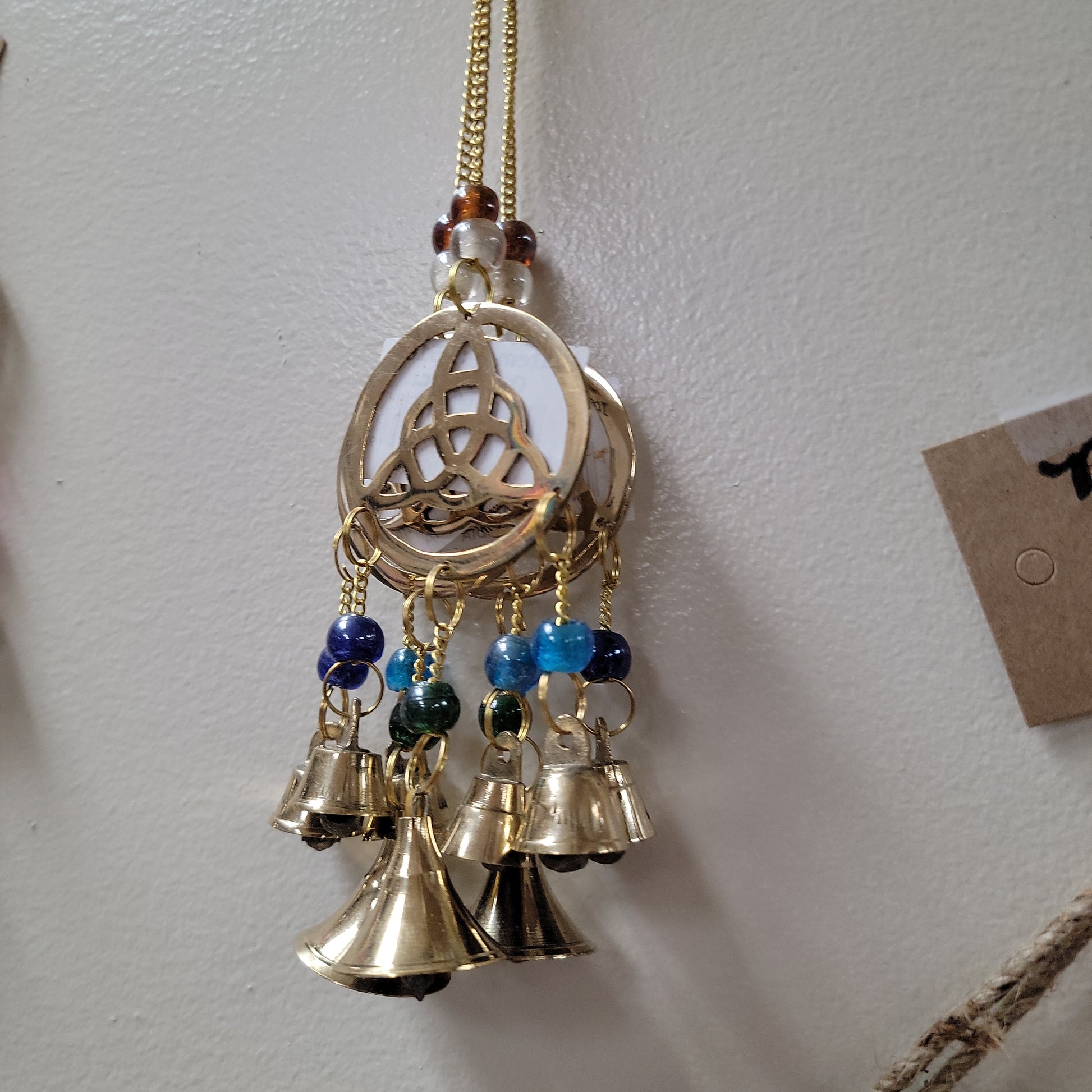 Simple and elegant in design, this small wind chime is perfect for hanging by windows, doorways, and altar spaces with its three small brass bells and central Triquetra image.