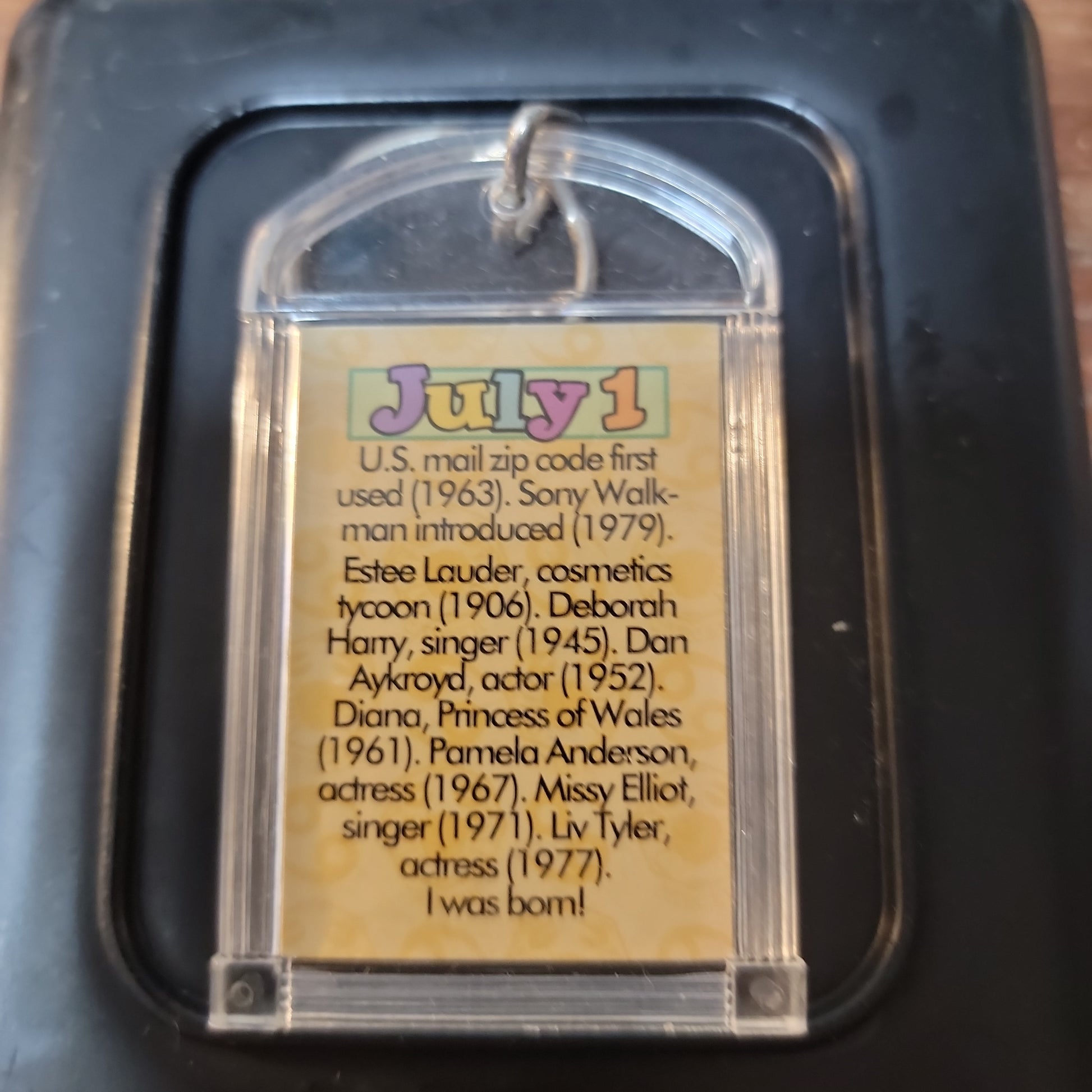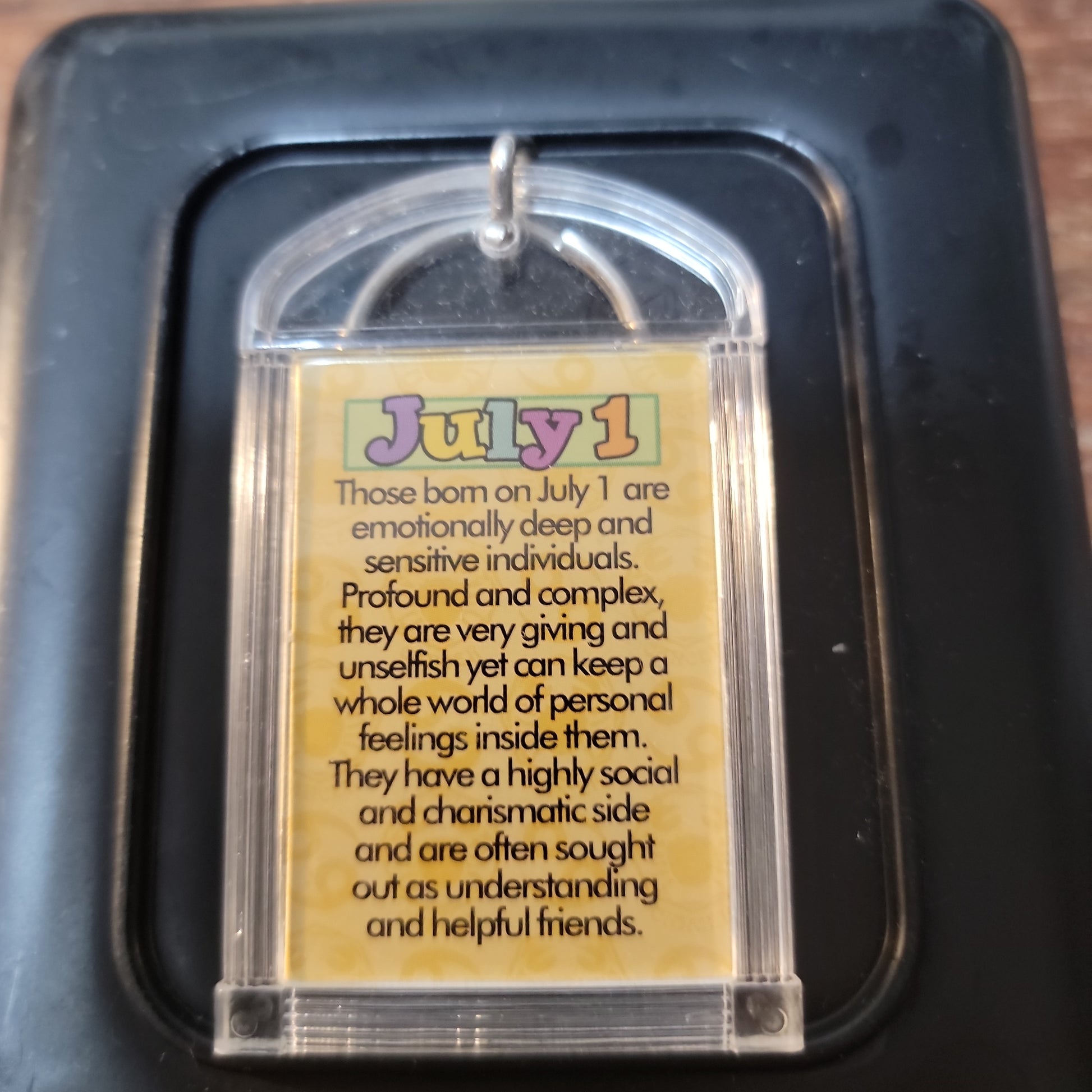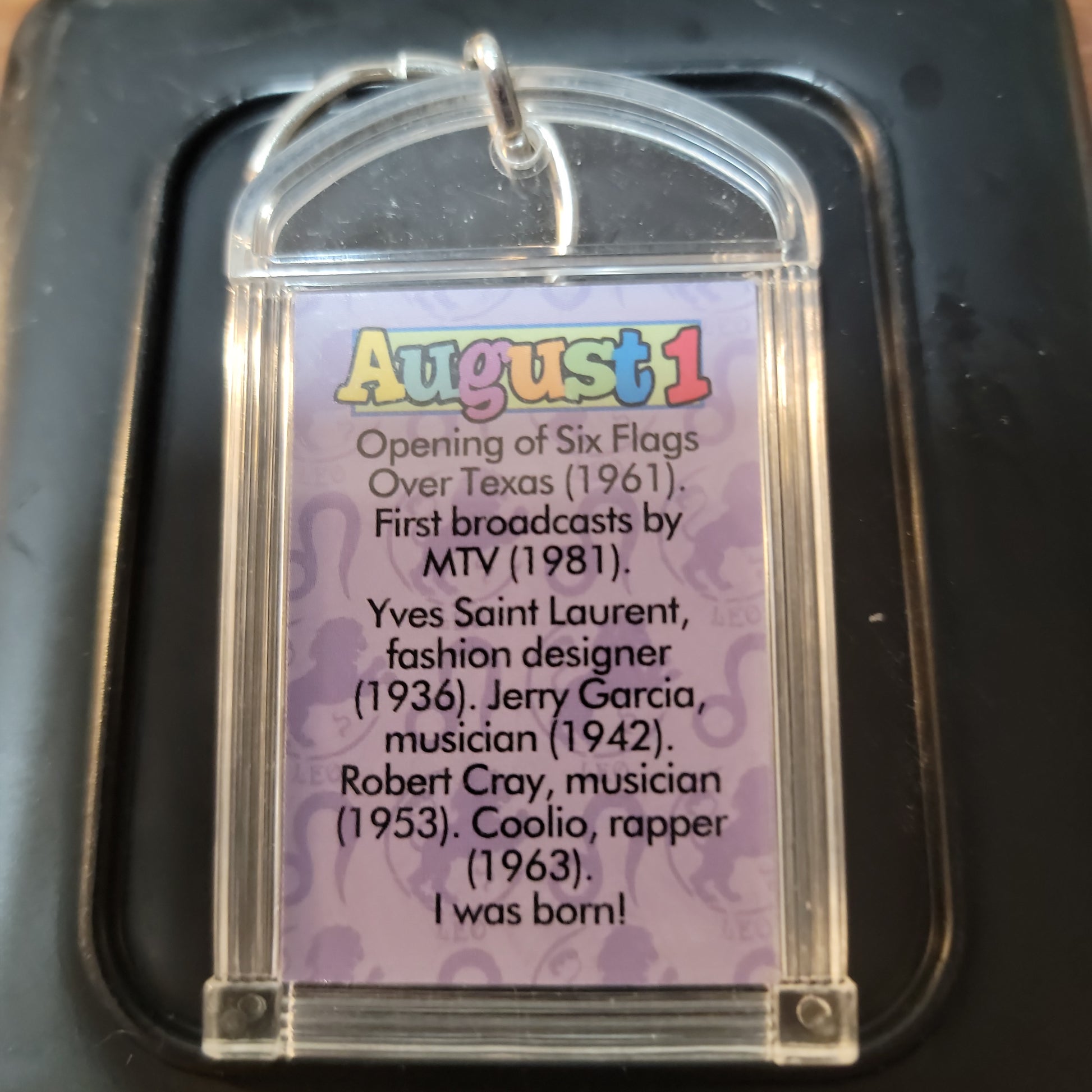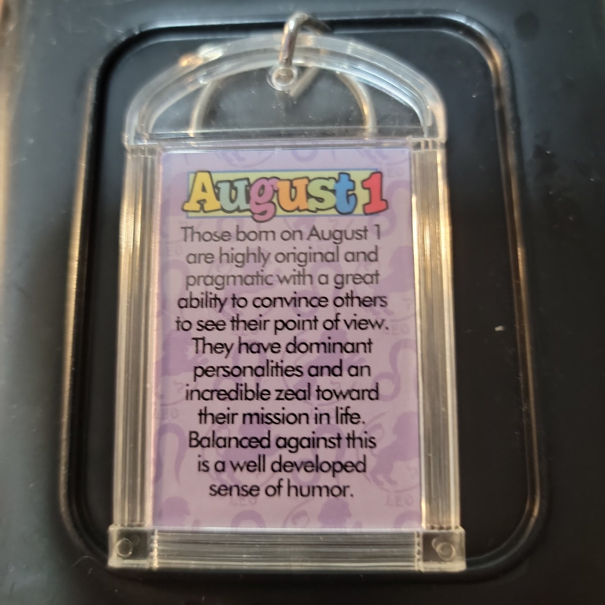 July And August picture shown is to give you an idea what the key chain looks like. The key chain has two sides the other side has things of what happened on that day and famous people who share the same birthday as you.
